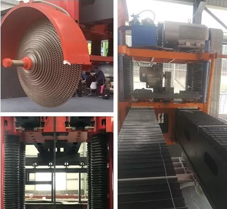 雙梁龍門切石機具有以下特點: 1. 即可掛26片塔形片,又可掛13套大小片。片數(shù)更多,產(chǎn)量更高。相比常規(guī)多片橋切機,可實現(xiàn)產(chǎn)量翻2-3倍; 2. 根據(jù)實際操作需要,可同時擺放2-4顆荒料進行切割; 3. 超大行程,最大可切深1.6米,在一定程度上取代框架鋸,切割成本是框架據(jù)的三分之一。投資更省,為客戶創(chuàng)造更高價值; 4. 采用超薄鋸片及高效節(jié)能的電機,實現(xiàn)了同樣產(chǎn)量,能耗更低,相比常規(guī)多片橋切,綜合成本可下降約30%; 5. 獨有的雙梁結(jié)構(gòu)及厚重的機身,使得切割穩(wěn)定性高,效果更好,精度更高,板面更平整,產(chǎn)量更高。
